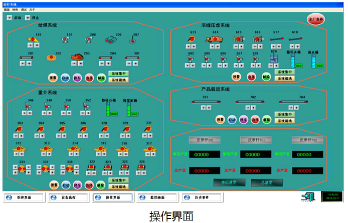 为满足生产工艺要求,根据可靠、实用、先进、合理的原则,采用以可编程序控制器(PLC)为主要控制元件的集中控制系统, 以实现对全厂主要动力设备的集中控制和设备运转状态的集中监视、设备故障自动处理和报警,以及全厂主要工艺参数的采集、动态显示, 同时作为主控机实现与重介质密度自动控制系统的信号联络及数据传送。