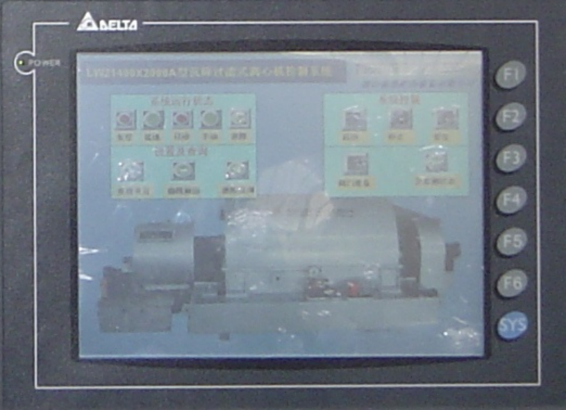 LWZAⅠ(Ⅱ)系列沉降过滤式离心机控制系统组成:SEC18C软启动器、西门子S7-200 PLC(CPU226)、电动机综合保护器、三相数显电压表、台达DOP-A80THTD1触摸屏。