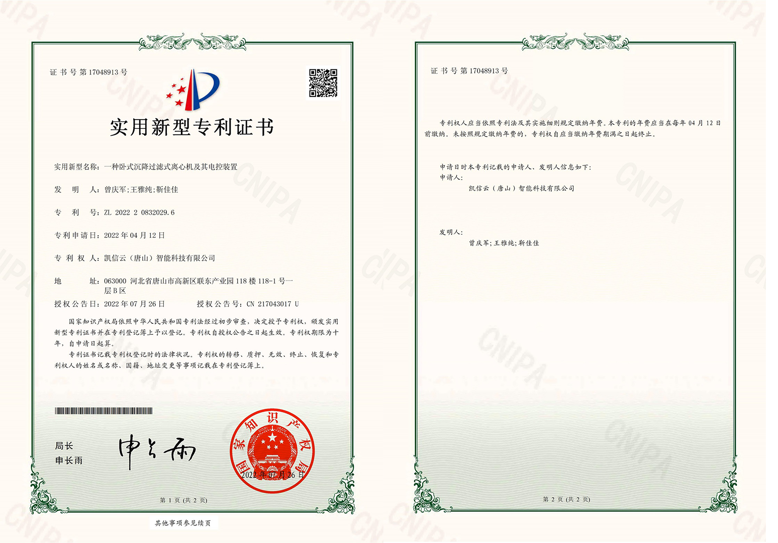 我公司在原沉降过滤式离心机控制系统的基础上开发、研制了一套新型智能化的离心机控制系统,并且已经获得了国家专利证书(ZL 2022 2 0832029. 6)。